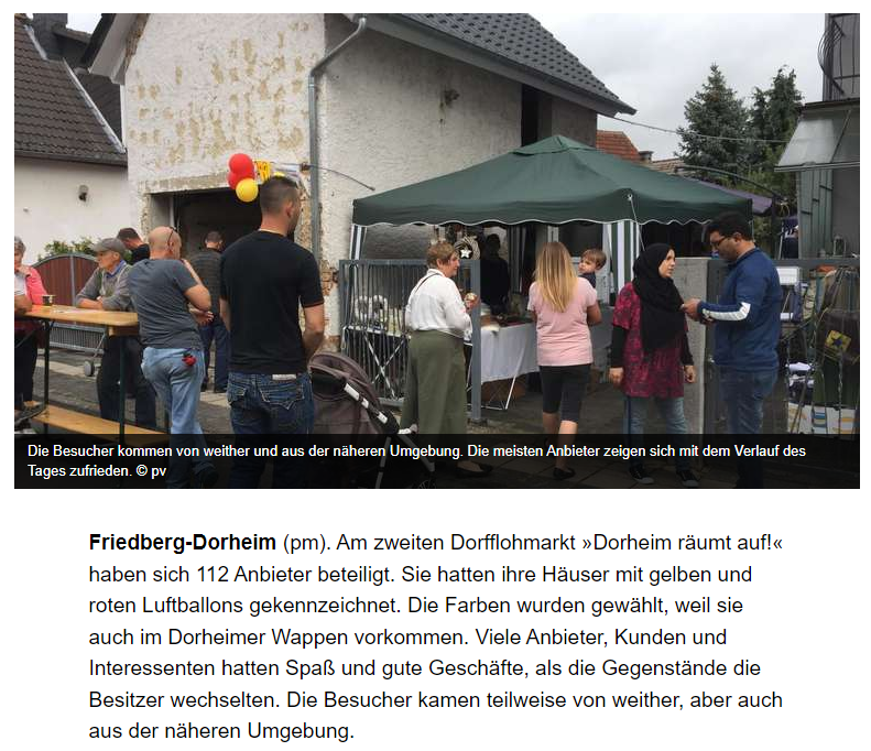 Der Dorheimer Hof Flohmarkt blickt auf eine erfolgreiche Geschichte zurück, die ihren Anfang im Jahr 2017 nahm. Damals initiierte die Dorheimerin Heike Strack den ersten Hof Flohmarkt, der sofort auf großes Interesse stieß. Dieser Erfolg führte dazu, dass der Hof Flohmarkt auch in den Jahren 2018 und 2019 wiederholt wurde und sich schnell zu einem festen Bestandteil der Dorheimer Gemeinschaft etablierte.
